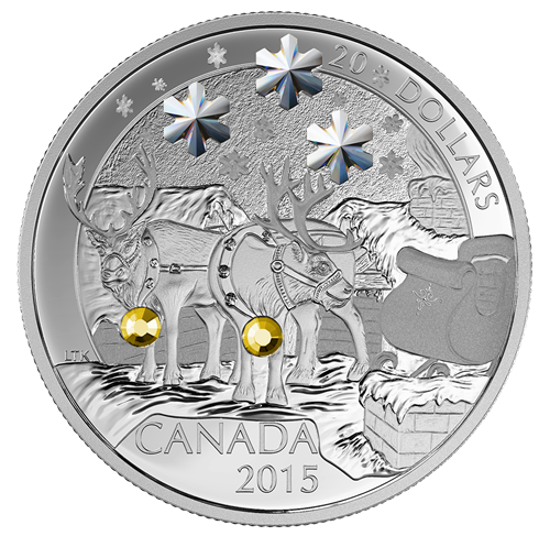 Designed by Canadian artist Lisa Thomson-Khan, your coin inspires a renewed belief in the magic of the holidays. In this winter wonderland, three snowflake-shaped Swarovski® crystal elements add a sparkle to the night air as fluffy, white snowflakes gently fall upon the slumbering landscape. The view is an unusual one, with brick chimneys in the background and overlapping the rim to the right of the image; given the presence of certain hooved creatures and a famous sleigh, it becomes immediately clear that it is Christmas Eve and we are rare witnesses to a special moment. There on a residential rooftop, two reindeer are prominently showcased, their features beautifullyrendered with detailed engraving. The viewer'seye is naturally drawn to the two round, yellow Swarovski® crystal elements that hang from the reindeer's harnesses and glisten against the snowy backdrop. As they stand waiting, one reindeer turns its head back to glance at the sleigh, as though it is at the ready to signal their passenger's return so that they may continue on their magical journey.