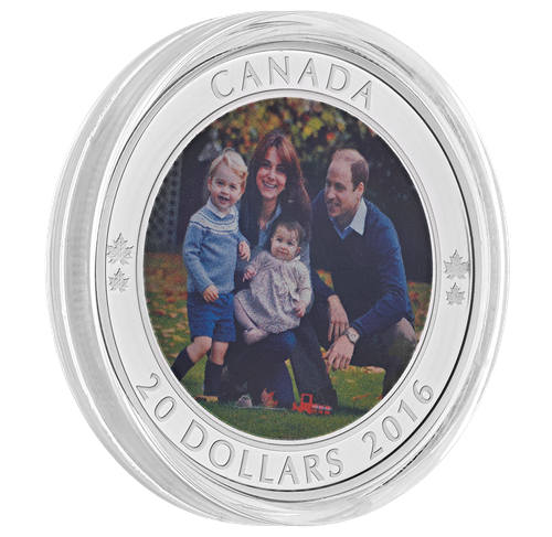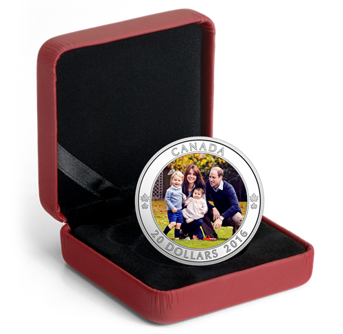 In commemoration of the 2016 Royal Tour of Canada, the coin featuresa full colour application that recreates photographer Chris Jelf’s portrait of Their Royal Highnesses The Duke and Duchess of Cambridge, Prince George and Princess Charlotte. The touching image is framed by an outer rim that includes four engravedmaple leaves to represent each member of this RoyalFamily, along with the engraved word “CANADA”, the face value “20 DOLLARS” and the year “2016”.
