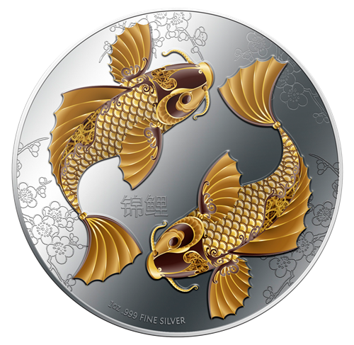 The design of this stunning coin issued by the New Zealand Mint features 2 Koi fish swimming, framed by abackground of delicate cherry blossoms.