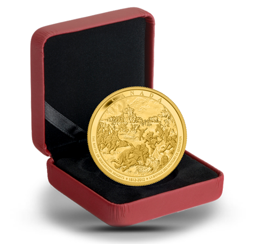 Your coin depicts details from John David Kelly’s renowned 1896 painting, Battle of Queenston Heights, 13 October 1812. The famous artworkis one of the most highly recognized portrayals of the War of 1812 and of the Battle of Queenston Heights. In the foreground, Major General Isaac Brock lies dying as his soldiers struggle in vain to move himto safety. Behind him, British troops, Canadian militia, and First Nations warriors rush headlong into battle with the oncoming Americans, the fires and smoke of battle and rolling highlands of the region visible in the distance. The image is striking for itssymbolic portrayal of British troops, Canadian militiamen, and First Nations warriors fighting togetherto fend off American invasion. Encircling the innerfield is a polished gold border engraved with the word “CANADA,” the bilingual text “THE BATTLE OF QUEENSTON HEIGHTS/LA BATTAILLE DES HAUTEURS DE QUEENSTON” and the dates “1812-2012.”