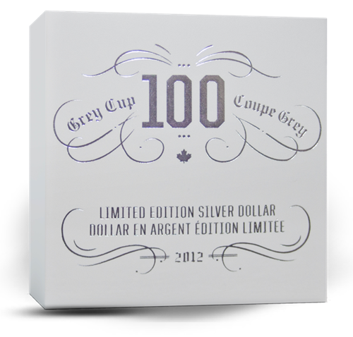 Designed by Bensimon Byrne, your coin features a stylized image of the Grey Cup Trophy mounted on its large base, set against a detail from the engraved text on the face of the Grey Cup. Embossed against this background is the number “100” in celebration of the 100th Grey Cup Game, the words “Grey Cup/Coupe Grey,” the face value, “Canada Dollar” and the year, “2012.”
