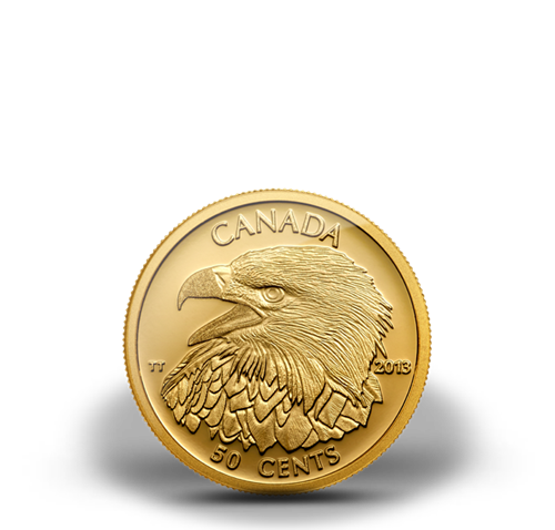 Your coin was designed by Canadian artist Trevor Tenant and features a profile portrait of a Bald Eagle. Presenting theanimal from its left side, the portrait features instriking detail the light-coloured head and dark upper wings and body of this majestic raptor. Its sharp hooked beak is open while its small, far-seeing left eye glares authoritatively at the viewer. The varied textures and tones of the eagle’s feathers are captured through expert engraving and finishing. The reverse is engraved with the word “CANADA,” the date“2013” and the face value of “50 CENTS.”
