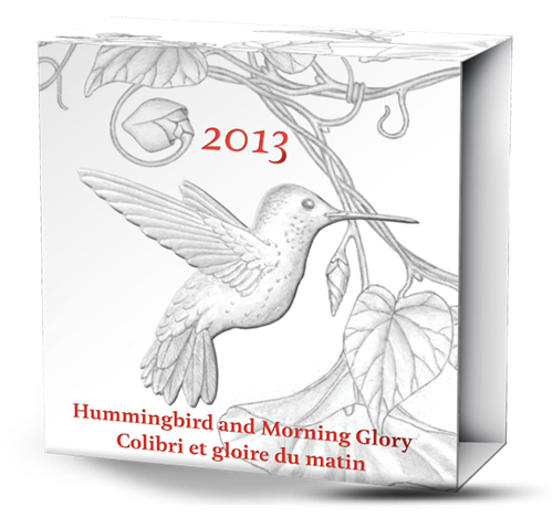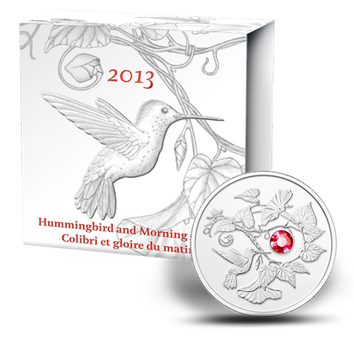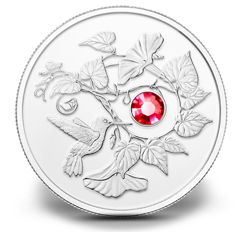Your coin features Canadian artist Yves Bérubé's image of a hummingbird and Morning Glory vine centered with a light Siam red Swarovski crystal element. Engraved in the finest detail, hummingbird and vine seem to come to life against the polished silver field. The hummingbird, eternally drawn tothe sparkling treasure at the centre of the image, is captured forever in a moment that, in life, is exceptionally fleeting.