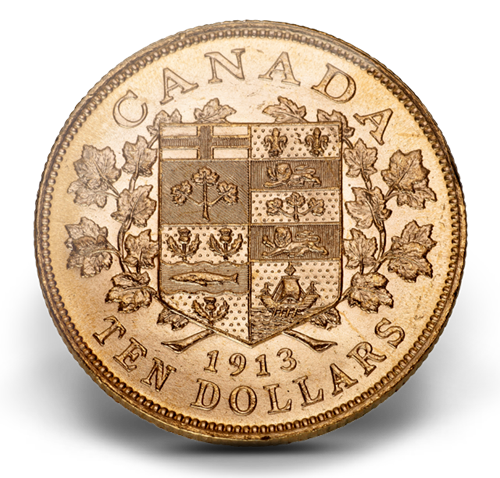 Your coin depicts a shield bearing thethen Canadian coat of arms, composed of the provincial arms of the Dominion of Canada: Ontario, Quebec,Nova Scotia, and New Brunswick. The shield is encircled by graceful maple boughs. The inscription “CANADA” is engraved above the shield, and the date 1913 and face value TEN DOLLARS is engraved below the shield. The effigy of King George V adorns the obverseside of your coins. Both sides of the coin are framed with a raised beaded circle.