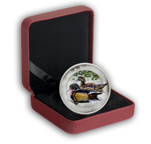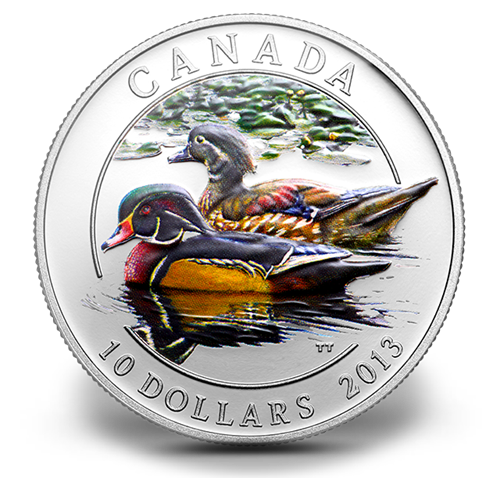 Designed by Canadian artist Trevor Tennant, your full-colour coin features a Wood Duck breeding pair swimming in a pond at the onset of fall migration. Every detail of the male's unique colour patternis majestically captured, his image beautifully reflected in the water. Beside him swims his female partner with her predominantly brown and white body, indigo and aubergine wing feathers and distinctive white eye markings. In the background is a dense group of green lily pads dotted with soft yellow waterlilies. The reverse is engraved with the word "CANADA," the date "2013" and the face value of "10 DOLLARS."
