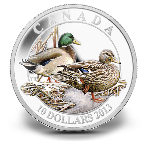 Your coin was designed by Canadian artist Trevor Tennant and features a mallard pair walking together along the snow-dusted shore of a Canadian waterway in late autumn, preparing themselves, perhaps, for the first leg of their migratory journey to warmer climes. Your coin is also engraved with the face value of “10 dollars” and “Canada 2013.”