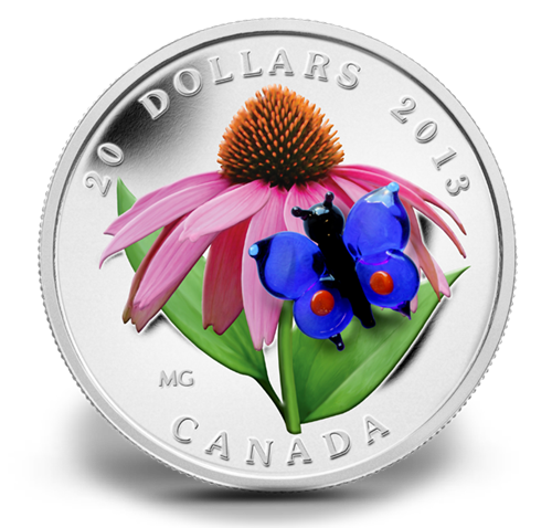 Canadian artist Maurice Gervais presents a stunning engraved and painted purple coneflower bloom. Theflower features a red-orange tubiflora centre and bright purple petals sitting atop a realistic green stem with two smooth leaves. Perched atop the flower’s lower-right petals is a jewel-like Venetian glass eastern tailed blue, hand-crafted by renowned Italian master glassmaker Giuliano Donaggio. The base of each dark blue-tinted translucent wings sports an orange dot. The reverse also features the word “CANADA,” the date “2013” and the face value of “20 DOLLARS.”
