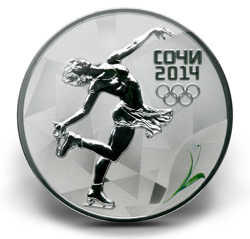 Designed by A.A. Brynza, your coin depicts an ice figure skater in a graceful spin. Your coin also includes a coloured detail of Voronov's Snowdrop; named for Russian botanist Y.N Voronov and found on the east coast of the Black Sea. Designed by E.V. Kramskaia, the obverse side of your coin depicts the relief image of the State Coat of Arms of the Russian Federation with a semicircular inscription over it "THE RUSSIAN FEDERATION", the denomination of the coin "THREE ROUBLES" and theyear of issue "2014 r.", the indication of the metal according to the D.I. MendeleyevPeriodic System of Elements, the purity, the trademark of the Saint Petersburg Mint and the fine precious metal content.