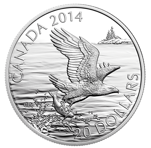 Designed by Canadian artist Claudio D'Angelo your coin features a Bald Eagle just having caught a fish. In the lower left side of the image, the water splashes high as the eagle wrenches the fishfrom its watery home. The eagle dominates the image, its stunning wings spread wide as it is viewed in full-body profile from its right side. Here we see the Bald Eagle's characteristic dark body and wings, white head and tail, and powerful legs and talons. In the distant background, a rocky point dotted with sparse conifers reaches out into the water, showcasing the Bald Eagle's preference for isolated waterside habitats.