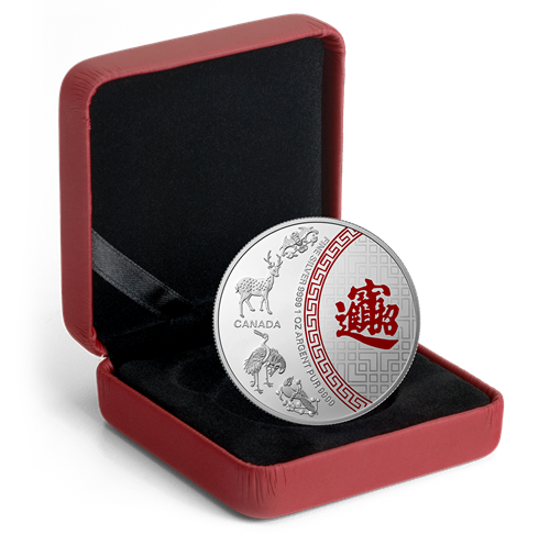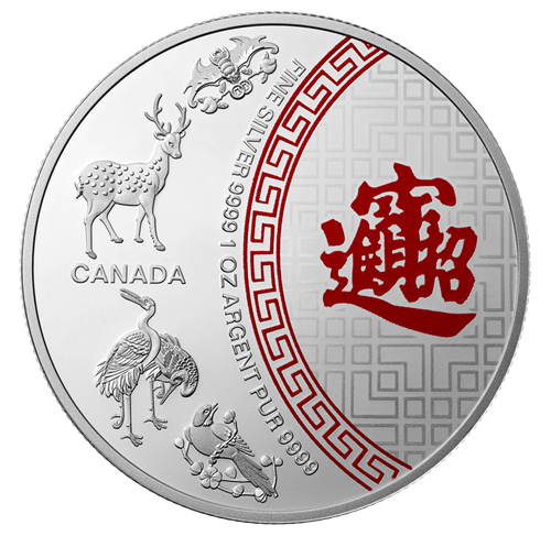 • This proof-quality 1-ounce 99.99% pure silver coin features a beautifully coloured and engraved design conferring upon its owner blessings of happiness, success, long life, joy, and good fortune.