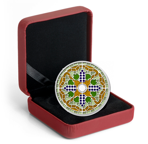 • The enamel, filling individual sections of the coin, is filled by hand to represent the stained glass panels from the window.