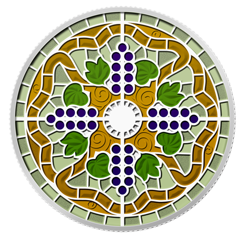 The reverse image of this coin features a colour reproduction of the central disc of the McCausland stained glass dome in Toronto's Casa Loma. At the heart of the disc lies a raised polished silver circle framed with engraved rays. The image is divided into four quadrants by raised silver lines spanning from the central circle to the coin's raised outer rim. Each of the four lines bears a stylized cluster of ninepurple grapes. These four clusters are separated from each other by dark green leaves set against a whimsically engraved lighter green palazzo-like background. A golden vine encircles the central portion of the image, winding its way around the coin from central curlicues that surround the central circle. The outer rim of the image is lined with alternating light green segments.