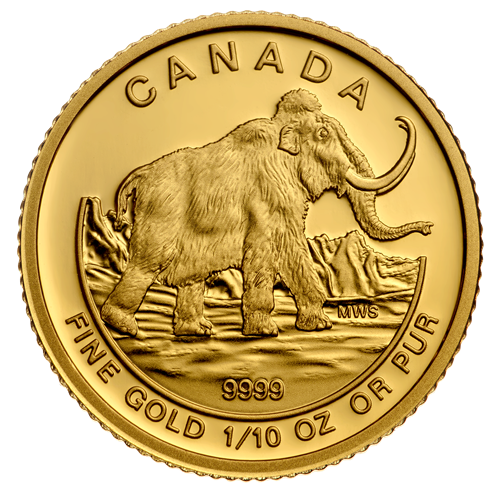 The coin features a scientifically accurate depiction of a woolly mammoth, verified by paleontologists from theRoyal Tyrrell Museum of Paleontology. With its head raised, the mammoth’s trunk is outstretched between its famously long, curved tusks. The thick, coarse fur that enables it to survive the colder temperatures is shorter here, reflecting the moulting that scientists believe took place in the early summer. The mammoth’s extra hump of fatis seen over the shoulders and are in the background, the low grasses and gentle sloping hills of the mammoth’s habitat stretches past the image’s outer rim on both sides.