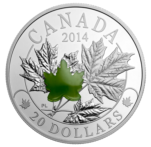 • First coin in subscription details maple leaves in pure silver, secondcoin includes maples leaves in a red and orange design reminiscent of the autumn season, third coin includes a maple leaf made from a jade stone, fourth coin is designed in 99.95% platinum, and you're final coin is designed in 99.99% pure gold