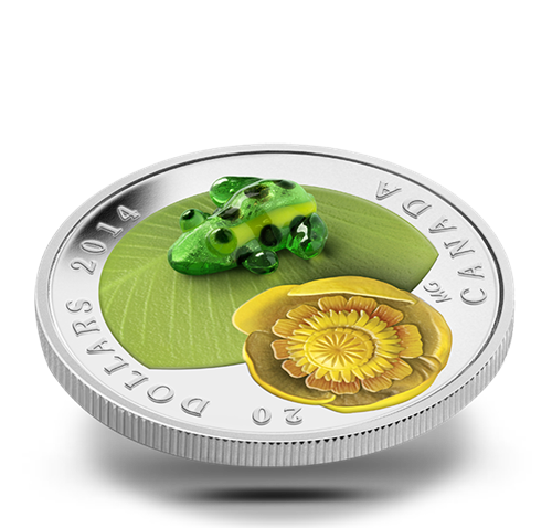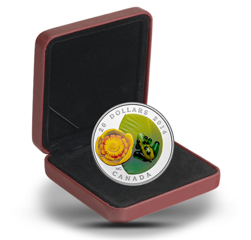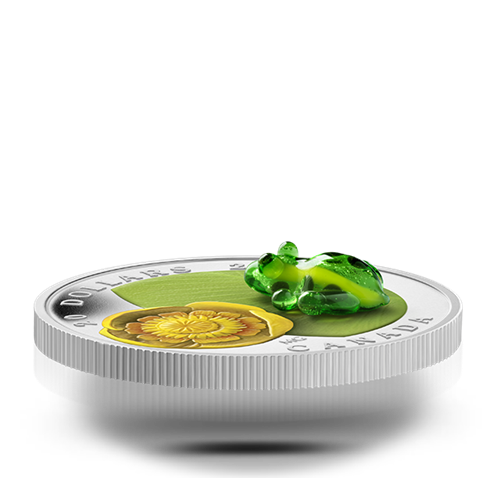Your coin was designed by Canadian artist Maurice Gervaisand features an engraved and painted Yellow Pond Lily (Nuphar variegatum) that occupies the left side of the image field. The blossom is in fool bloom, itsouter cup shaped petals opened to reveal the circular pattern of stamens cradled inside. A stunning, translucent green Leopard Frog made of Venetian glass and hand-crafted by Giuliano Donaggio – a master glassmaker in Murano, Italy – sits upon the engraved and coloured green lily pad leaf in the right portion of the image field.