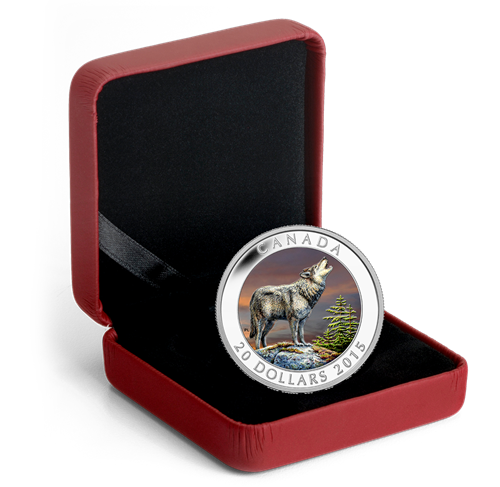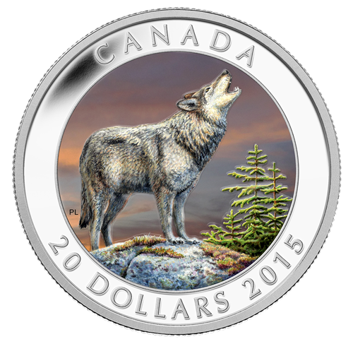 The reverse design by Canadian artist Pierre Leduc features a howling wolfin its natural habitat, presented in full colour over an engraved surface.