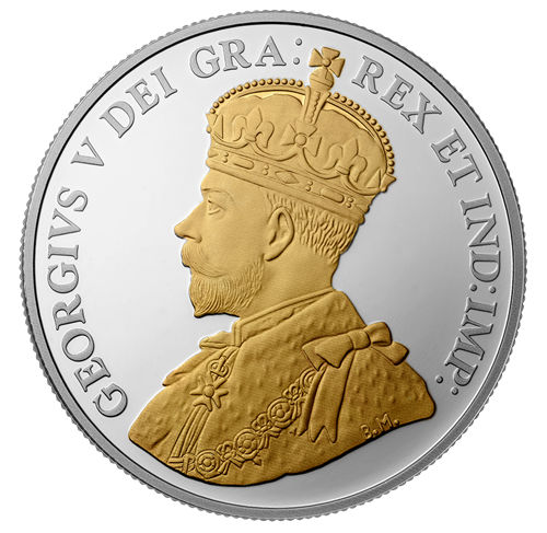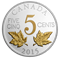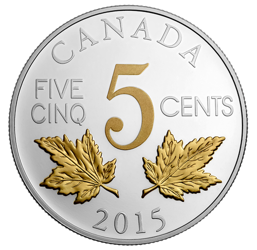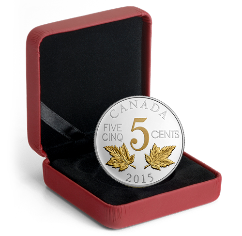 Your coin features a recreation of William James Henry Blakemore's 1922 redesign of Canada's 5-cent coin. Finely detailed engraving, multiple finishes and selective gold plating breathe new life and more definition to the original design, which features two maple leaves facing outward from the centre. They frame the bottom of a stylistically rendered "5" which paired with the words "FIVE" "CINQ" and "CENTS" indicate the face value. Also engraved onthe reverse are the word "CANADA"and the year "2015". The obverse features the effigy of King George V, who was the reigning monarch from 1910 to 1936 by Sir E. B. MacKennal.