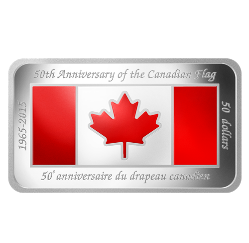 50e ANNIVERSAIRE DU DRAPEAU CANADIEN," the face value "50 dollars" and the commemorative dates "1965-2015".