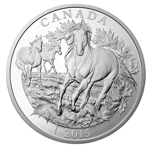 The year 2015 marks the 350th anniversary of the introduction of the Canadian horse. Robust, resilient, and good natured, the petit cheval de fer—the "little iron horse," as it became known in its native Quebec—has survived near extinction to emerge as one of Canada's official national symbols. The Royal Canadian Mint proudly celebrates the anniversary of its introduction with a unique half-kilogram coin of 99.99% pure silver.