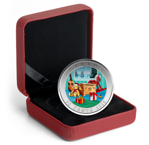 Designed by Canadian artist Joel Kimmel, your coin recaptures the magical childhood memories that surroundthe holidays with a nostalgic look at an old-fashioned, wooden toy box. As the central focal point ofthe dynamic design, the toy area in the first imageseems relatively quiet on Christmas Eve as most ofthe toys have been carefully put away inside the toy box and wrapped gifts holds their secret content ready to be opened at the right time! To the left ofthe toy box, an acoustic guitar leans against the wall beside the window while a stuffed rabbit sits on the floor in front of it, gently worn from years of being a well-loved companion; on the other side of the toy box lies a wooden rocking horse and a spinning top. Once the coin is tilted, a second image shows the remarkable transformation on Christmas morning: the toy box is now overflowing with a bounty of newly unwrapped toys! A model airplane hangs above the lid, which can no longer be closed with all of the new additions to the toy box, among all, a basketball, a teddy bear, a locomotive and a doll. On the windowsill sits a world globe for a would-be adventurer to look up new places to see, while an antique style metal toy car on the floor seems ready for any imaginary travel. A tin robot promises to add a sci-fi, futuristic twist to any storyline while in the front of the toy box lay a few colourful toy blocks. The selection is dizzying for a grateful young child, who will surely have a hard time selecting which toy to play with first; but the scene is also a reminder for grown-ups of the simpler joys to be had, and the ways in which life can bring delightful surprises.