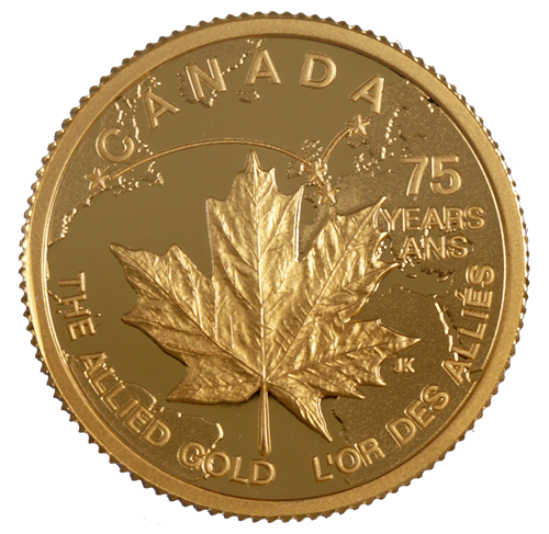 The reverse image by Canadian artist Joel Kimmel presents the route taken by the Norwegian gold to Canada by way of England. This coin's symbolically rich reverse design is layered over a stylized map showing northern Europe, the Atlantic, and eastern Canada. Four stars mark strategic regions of gold movement from Europe to Canada during the war, including Norway, England, France, and Canada. Engraved overthe map is a maple leaf whose left side is from a Canadian sugar maple and whose right side is from aNorway maple. The reverse is also engraved with thebilingual commemorative text "THE ALLIED GOLD/L'OR DES ALLIÉS" and "75 YEARS/ANS" and the word "CANADA."