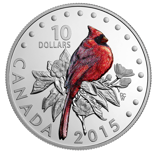 The first coin in your subscription was designed by Canadian artist Derek C. Wicks and features a beautiful rendition of a northern cardinal in a tranquil setting. Finely detailed engraving showcases this songbird's distinctive features—from the pointed crest atop its head to its thick, short bill, as well as the soft feathers that lead to its tail. The use of selective colouring recreates the northern cardinal's brilliant red plumage viewed in three-quarter profile, as the bird sits nestled amidst engraved leaves and flower blossoms.