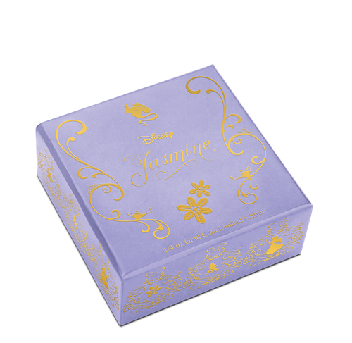 The Disney Princess Jasmine 1/4 oz. gold coin comes presented in delightful fairy-tale styled outer packaging and a high-quality wooden inner coin case. The themed packaging makes this coin an ideal gift for any Disney fan or coin collector. The certificate of authenticity sits within the packaging.