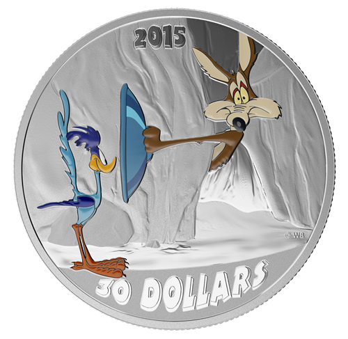 The reverse image, provided by Warner Brothers, showcases the antagonistic pairing of Wile E. Coyote and Road Runner in a scene from their first Looney Tunes short, Fast and Furry-ous (1949). The use of selective colour brings the engraved Road Runner and Wile E. Coyote to life. Staring at the viewer with an incredulous look on his face, Wile E. Coyote has held out a lid in front of Road Runner in hopes that it will slow the bird. Seen in side-profile, Road Runner smiles knowingly ashe stops just short of the lid, seizing quickly that his pursuer might not be as clever as he thinks heis. The obverse features the effigy of Her Majesty Queen Elizabeth II by Susanna Blunt.