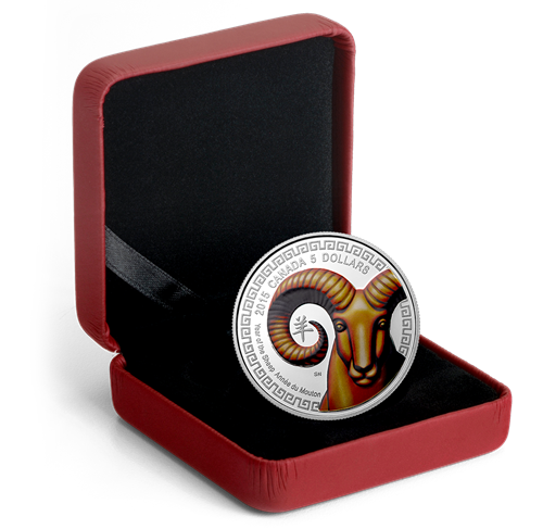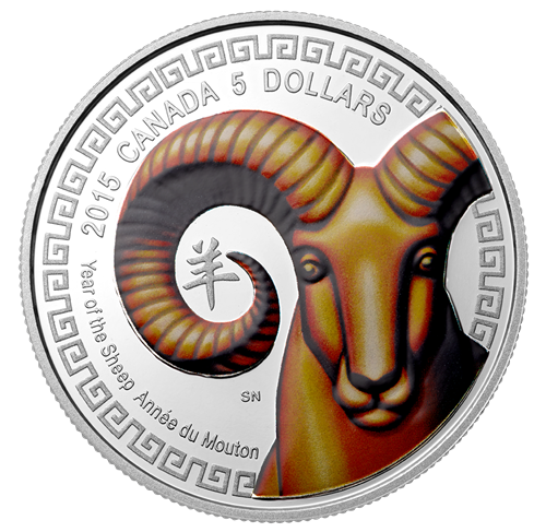 The reverse image features an artistic rendering of aBighorn sheep – a native of Canada'sRocky Mountains. The use of colour showcases the sheep's beautiful brown colouring. Nestled withinthe curl of the sheep's distinctive spiral horn, the Chinese character yang (meaning "sheep" or "goat") denotes the Year of the Sheep.