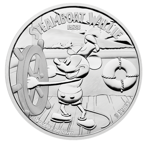 This finely engraved classic 1-kg 99.9% Fine Silver Proof Coin (999 Fine Silver) features the image of Mickey Mouse from his first feature film: Steamboat Willie from 1928. It is the latestrelease in the officially licensed Disney Collectible Coins series.