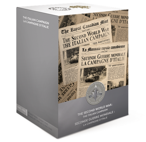 The Italian Campaign was Canada's first full-scale ground operation of the Second World War. By the summer of 1943, the Allies were revitalised by victories in North Africa and were seeking to open up a second battlefront by invading Germany's Axis ally, Italy. On the morning of July 10, 1943, Canada joinedits allies in the planned invasion of Sicily; in September, they began their slow crawl up the mountainous Italian peninsula. Although the Allies would ultimately be victorious, the 20-month operation proved to be a bitterly fought campaign against occupying Nazi forces who fiercely defended their hold at every turn. On the 70th anniversary of this strategic operation, the Royal Canadian Mint honours Canada's veterans of this Second World War campaign with a fine silver coin that offers a glimpse of the realities of the war in places such as Ortona, Cassino and Rimini.