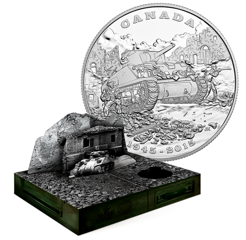 Designed by Canadian illustrator Joel Kimmel, your coin recreates the sense of danger and the fierce fighting that awaited Canadian soldiers in the narrow streets of Italian towns such as Ortona during the winter of 1943. In the background, the crumbling remnants of stone buildings are indicative of the sheerdestruction caused by combat that was often foughtin close quarters. In the centre, a Canadian Sherman tank rumbles through the rubble-filled streets, causing dust to fill the air behind it. The tank is flanked by two Canadian soldiers who, despite the risk of sniper fire and landmines, bravely move alongthe streets as they clear the town and search for survivors.