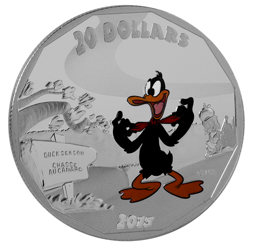Depicts a scene from the Duck Season/Wabbit Season trilogy of cartoons. In the foreground, rich colouring brings the black-feathered, orange-billed Daffy Duck to life as he fixes a red bowtie. Expert engraving is enhanced by the use of multiple finishes, bringing to life the forest setting and the sign to the left of Daffy, which reads “Duck Season/Chasse au canard.” But trouble looms as an engraved rendering of Elmer Fudd in his hunting clothes can be seen approaching on the right side of the image.