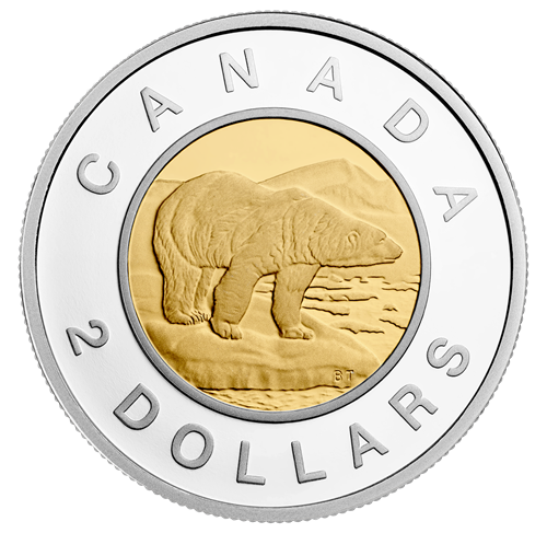• 2 dollar (toonie) coin struck in 99.99% pure silver with selective gold plating