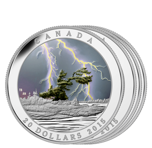 The first coin in your subscription was designed by two Canadian artists, Tony Bianco and Arnold Nogy, and represents a stormy natural landscape. A lone eastern white pine, shaped by steady winds, rises from a smallrocky island in Ontario’s Georgian Bay. In the distance, stylized forests cower under a stormy sky that seems to glow with energy as Mother Nature unleashes her power. Viewing the reverse under a black light (included) activates the coin’sspecialized technology, allowing the lightning bolts to radiate across the sky with a stunning life-like intensity and exceptional luminosity.
