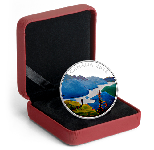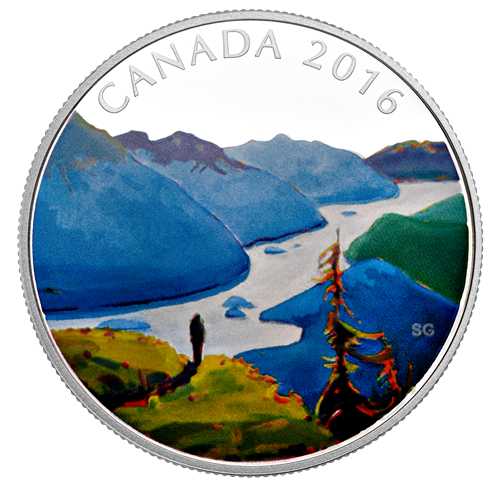 Designed by Canadian artist Stéphanie Gauvin, your coin features a selectively painted depiction of the view from Idaho Peak in the WestKootenay region of British Columbia. Surrounded bythe colourful alpine wildflowers, a hiker stands atthe edge of the ridge and contemplates the journey. Selective paint over detailed engraving recreate the breathtaking view overlooking the winding SlocanLake below, with the Valhalla Mountain Range rising up in the background. The coin's silver surface recreates the bright glow of the fading mid-summer sun, which bathes the landscape in a warm and colourful glow that transforms the scenery into an artist's dream. The obverse features the effigy of