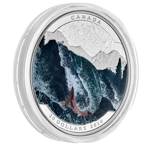 Designed by Canadian artist Julius T. Csotonyi, your coin features a towering waterfall beautifully crafted in colour. Water cascades down the rocky cliff, but on closer examination, a salmon emerges from the scene. It is leaping upwards to get beyond the falls in order to continue its incredible migration against the current to spawn. The salmon's body, mouth and eye are visible in the rushing cascades while the driftwood and stone below form the shape of its tail. Above, the salmon's left pectoral fin is found in an unwavering bush that isgrowing in the middle of the falls.
