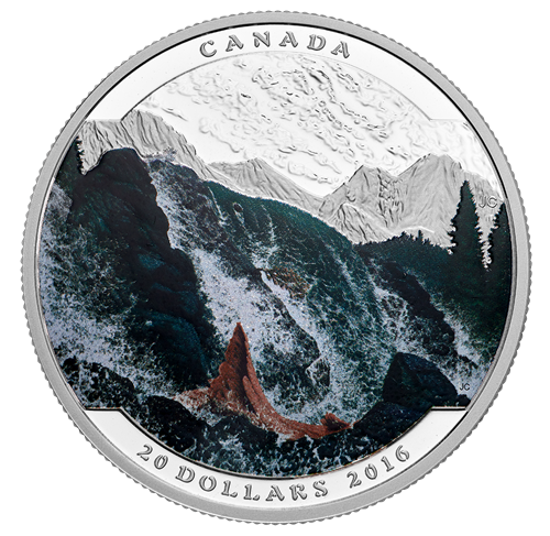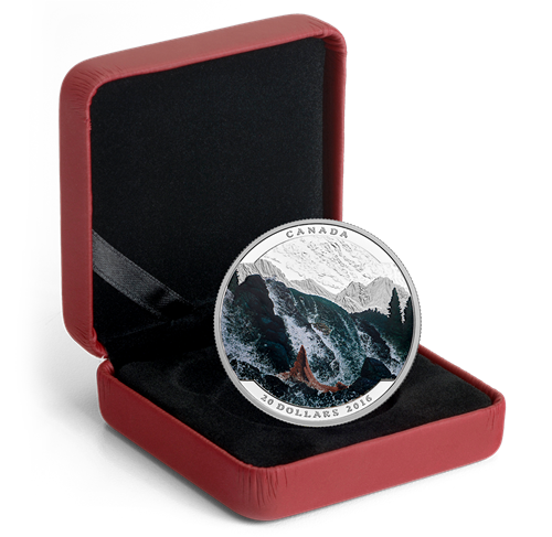 This exciting coin series brings you the fascinating art of illusion to celebrate Canada's natural heritagewith unprecedented and utterly captivating designs.Each coin features an image of the Canadian landscape, but combines natural elements in the scene to create an optical illusion of an animal—like the salmon on this coin featuring a waterfall.