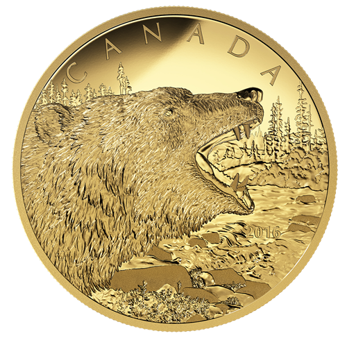 The grizzly bear is one of nature's most imposing sights—even more so when it roars. This exceptionally detailed, low-mintage coin captures all the power of that fearsome stance in pure gold, set against a background depicting the vast remoteness of the Canadian wilderness.