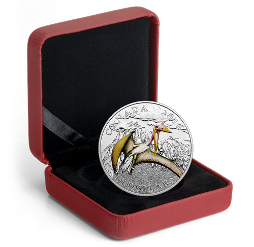 Designed by Canadian artist Dino Pulera, your coin features an intricately engraved rendition of how a Quetzalcoatlus likely appeared, and was reviewed for scientific accuracy by palaeontologist at the Royal Tyrrell Museum of Palaeontology. The use of selective colour brings this long-gone species to life in incredible detail; soaring with only an occasional flap of its enormous wings, the terrifyingly large reptile keeps one wing bent towards the viewer while the left wing is outstretched. Its long, pointed beak is open wide, releasing a cry into the wind as it prepares to swoop down to find prey. The coin's own silver surface recreates radiant rays of bright sunlight peeking through the clouds above the distant mountains, which convey how high the plane-sized creature would soar above the conifer forest below.