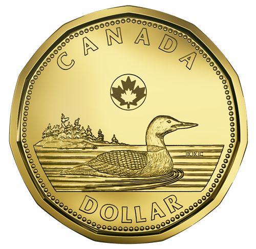 Launched in 1987, the reverse of the one-dollar coin represents a common loon swimming against the rugged backdrop of the Canadian Shield. The loon's haunting calls are one the quintessential sound of the Canadian wilderness in summer.