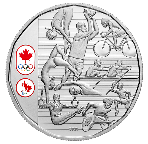 The reverse design by Three Degrees Creative Group isan energizing montage showcasing the diversity of exciting events that will propel athletes to new heights as they compete for gold at Rio 2016. The Canadian Olympic and Paralympic Team logos punctuate thedesign with colour.