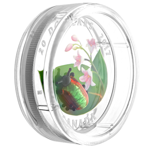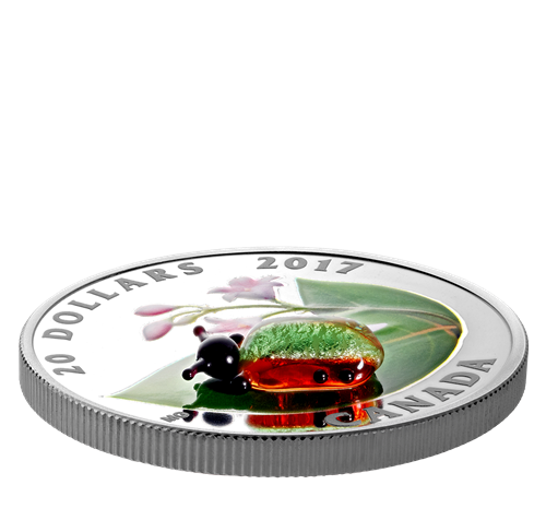 Your coin's design is punctuated by a shimmering Venetian glass beetle handcrafted by master glassmaker Giuliano Donaggio in Murano, Italy. The glass beetle is poised on a coloured design by Canadian artist Maurice Gervais that features the leaves and pink, bell-shaped flowers of the dogbane plant, one of the beetle's preferred food sources.
