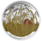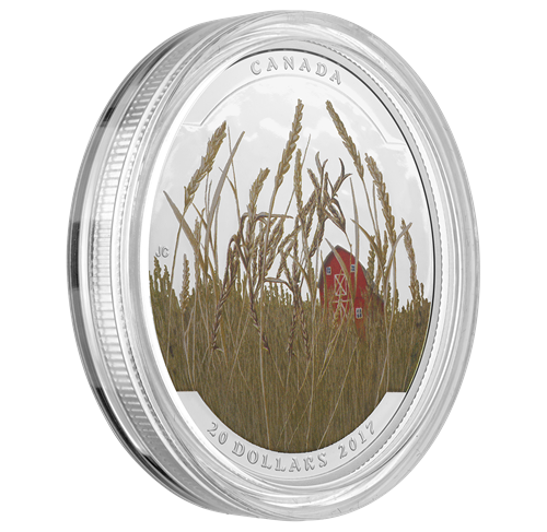 At first glance, this beautiful coloured coin features a wheat field viewed from deep within the grass, a red barn in the distance. On closer examination, a pronghorn emerges from the scene. It is hidden among the stalks of wheat that tower overhead, shaped by the heads of wheat, the leaves and stems, and the manner in which these elements overlap—pure mastery of illusion!