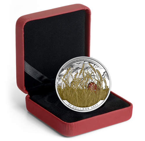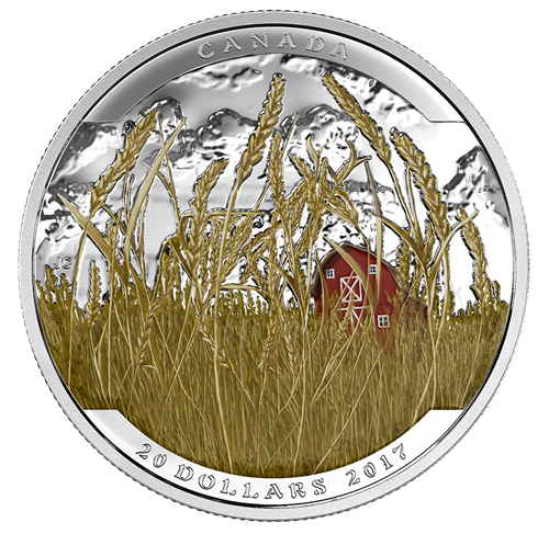 Designed by Canadian artist Julius T. Csotonyi, yourcoin features a wheat field beautifully crafted in colour. The viewpoint is from deep within the grass, looking towards a red barn in the distance. Stalks of wheat tower overhead, but on closer examination, a pronghorn emerges from the scene, shaped by theheads of wheat, the leaves and stems, and the manner in which these elements overlap.