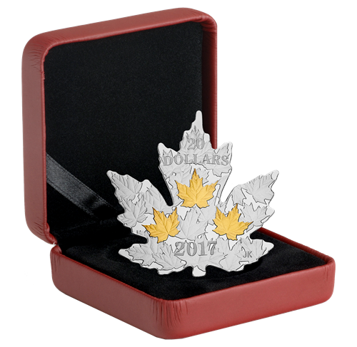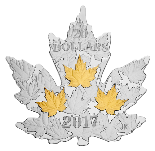 Careful sculpting and finely detailed engraving capture the natural beauty of sugar maple (Acer saccharum) leaves in all their intricate beauty.A true-to-life recreation of the leaf's silhouette, the coin's unusual shape provides a fitting canvas for this celebration of a Canadian icon,whose irregular edges and five palmate lobes have been painstakingly replicated through a labour-intensive process. Designed by Canadian artist Joel Kimmel, your coin includes multiple engraved maple leaves that fill the entirety of the reverse. The scattered positioning of these leaves deliberately evokesan autumn day, when the leaves have softly tumbledto cover the ground. While the reverse also features the engraved face value "20 DOLLARS" and the year "2017", the spotlight shines brightly on the three gilded maple leaves that each represent 50 years of Canadian history—a symbolic nod to the 150th anniversary of Confederation. The selective application of gold plating technology further enhances the deeply engraved veining, while giving each leaf a rich golden hue that shinesas bright as a sunny autumn day.