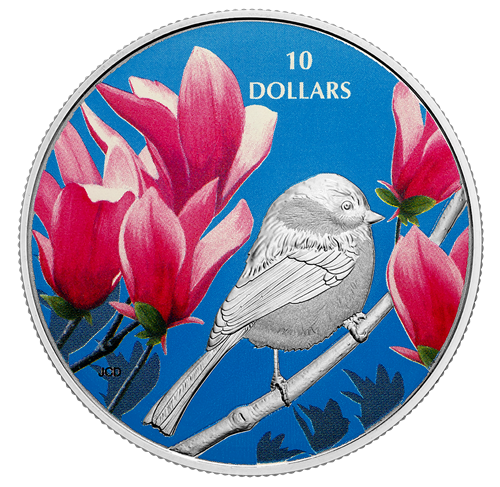 Designed by Canadian artist Jean-Charles Daumas, your first coin in your subscription the chickadee deftly combines sumptuous colours and intricate engraving that leaves one with an appreciation for nature's beauty. The selective application of colour recreates the soft pink and white hues of themagnolia (Magnoliaceae) blossoms, which evoke a warm, sunny day in May. One can imagine the musical call of the black-capped chickadee (Poecile atricapillus) filling the air as it sits perched on the branch; engraved in outstanding detail, the diminutive chickadee presents its right-side profile to allow the viewer to study its body shape and narrow tail.