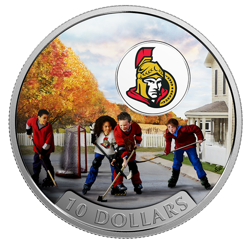 Designed by Canadian artist Silvia Pecota, your coin features full colour over an engraved scenethat celebrates hockey in the nation's capital, where young Ottawa Senators fans head outdoors to play street hockey. The autumn colours of EasternOntario are in full view in the background, where the red, orange and yellow maple foliage adds a burst of colour to a balmy afternoon in this quiet residential neighbourhood. Four youths on roller blades scramble for the puck. One boy rolls behind the unguarded net to join the boy and girl in the foreground, each one bearing a wide grin that is a natural expression of their enthusiasm and deep love for thegame. Above them, the team logo of the Ottawa Senators features a forward-facing Roman senator wrappedin a red-coloured cape and set against a semi-circle of laurel leaves, whose “O” shape is associated with the home city of Ottawa.