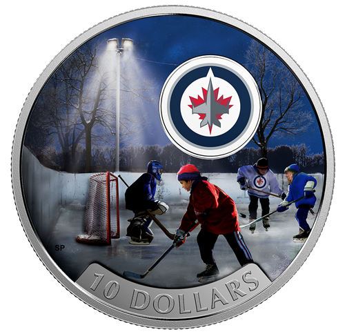 Designed by Canadian artist Silvia Pecota, your coin features full colour over an engraved scene, which is set at an outdoor rink in Manitoba. Beneath the overhead lights, four youths share a love for the game as they continue to play into the evening. In the foreground, one player in red, skates towards the boards to retrieve the puck, while the two other players on the right are still in position from the last attempt to score. The goaltender stands before the net, somewhat relaxed but with eyes trained on the two players closest to the crease. Allfour players are proudly wearing the blue, white and red colours of their beloved home team; above them is the official logo of the Winnipeg Jets, featuring a fighter jet over a maple leaf and all enclosed in a blue roundel.