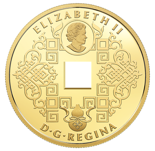 Designed by Canadian artist Charles Vinh, your coin combines a number of auspicious Chinese motifs to confer a powerful blessing for everlasting prosperity and fortune. At the centre is a feature that sets this coin apart: a square hole, which represented the land in traditional Chinese minting. Two Pi Yao figures stand on either side of the hole and are viewed in profile, with one facing left and the other facing right. Enhanced by different finishes, the intricate engraving re-creates the elaborate appearance of this mystical protector and symbol of wealth. The rounded shape of the Wu Lou gourd is depicted on the reverse and the obverse, where this centuries-old symbol of longevity and health appears alongside the ornamental Chinese knots that speak of never-ending felicity. These endless knots also complement the stylized scrollwork on the obverse, where a smoothly polished circle bears the effigy of Her Majesty Queen Elizabeth II by Susanna Blunt.